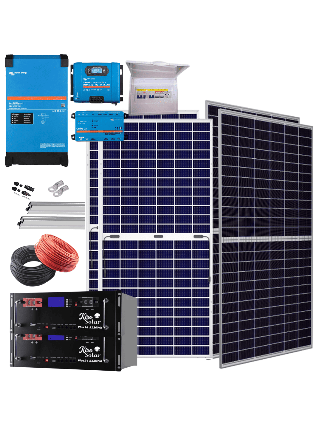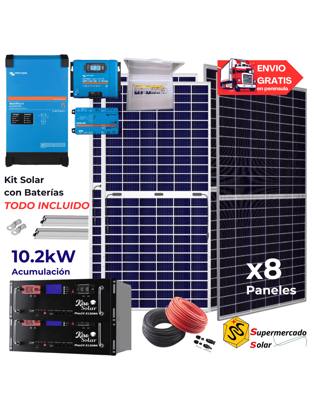 Kit solar con baterías de Litio para iluminación LED, Televisión LED, Nevera A++, Microondas, Bomba 1CV, Lavadora, Lavavajillas, Vitrocerámica y pequeños consumos. Este kit se puede modificar ajustándolo a sus necesidades.