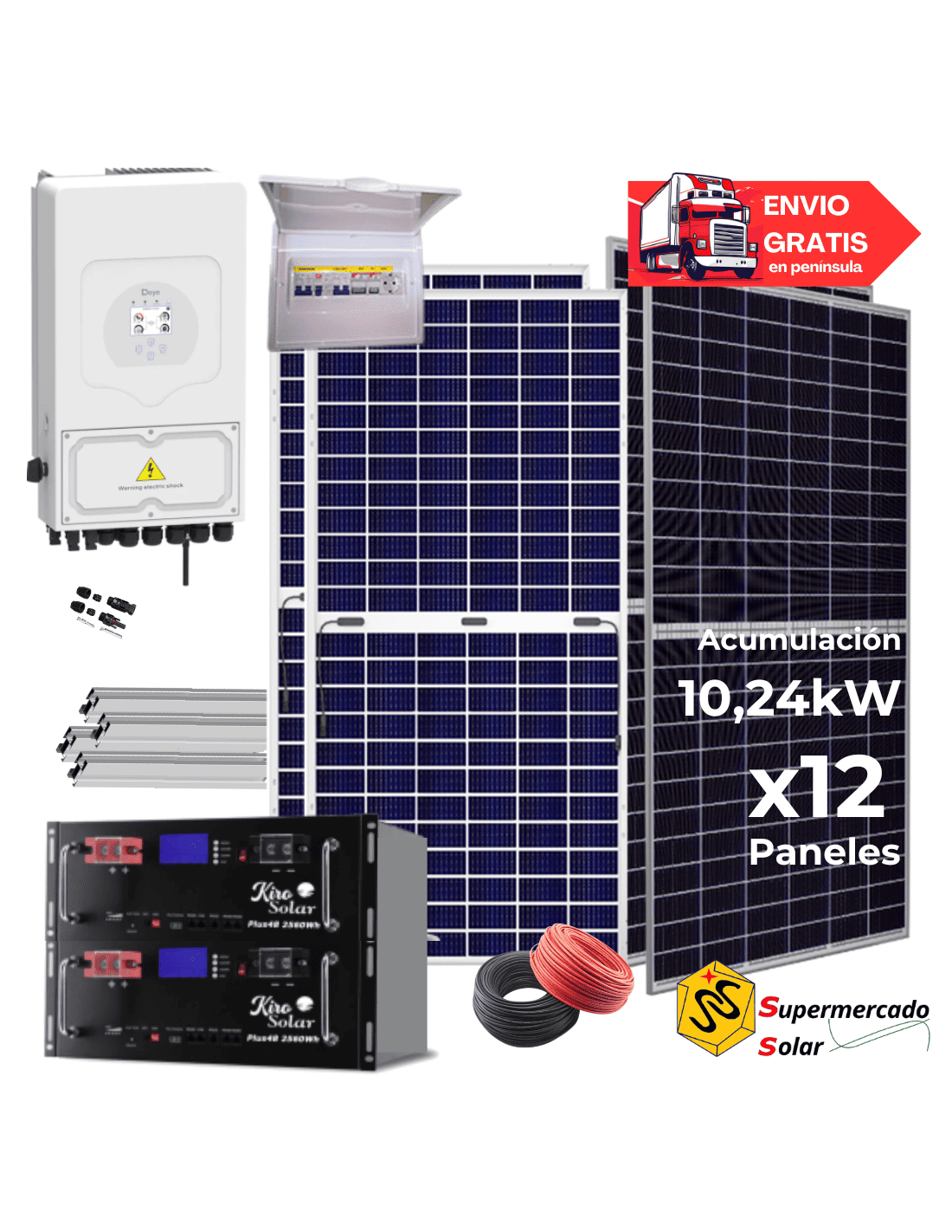 Los kits de SupermercadoSolar incluyen todos los elementos necesarios para su funcionamiento, las placas solares, inversores, reguladores de carga, baterías solares, soportes, fusibles, cuadros de protecciones, cables de conexión. También se adjunta las instrucciones de montaje y un plano de instalación detallado para facilitar su puesta en marcha. Los inversores vienen configurados para el correcto funcionamiento dependiendo de las baterías que se conecten.