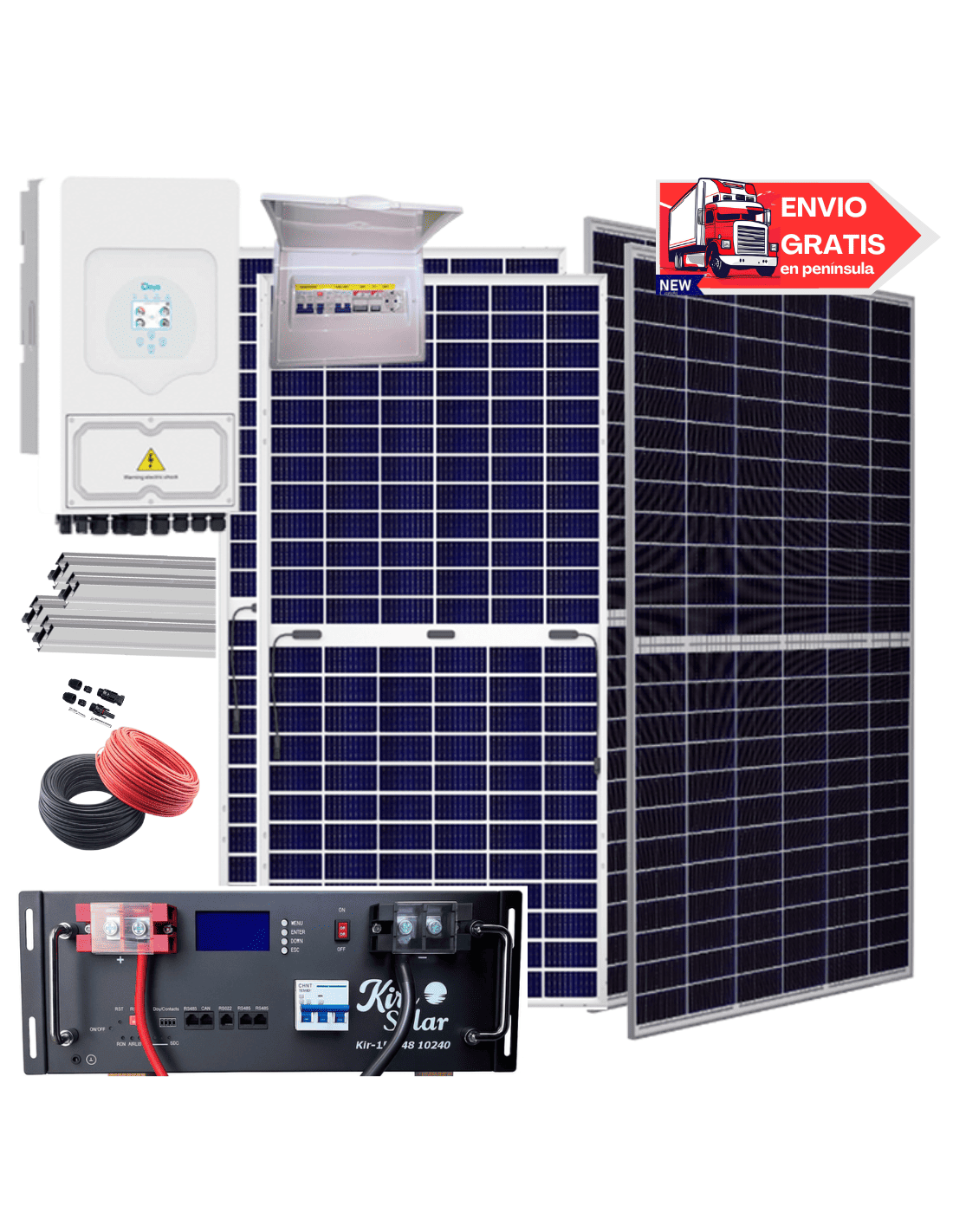Este kit solar incluye todos los elementos necesarios para realizar una instalación completa y eficiente. Es una solución solar muy flexible y de alto rendimiento, pensada tanto para sistemas de autoconsumo conectados a la red como para instalaciones aisladas sin acceso a la red eléctrica.
