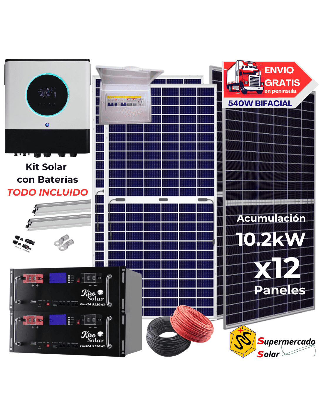 Este sistema incluye baterías de litio de 48V, reconocidas por su alta capacidad de almacenamiento, durabilidad y eficiencia. Estas baterías garantizan un suministro energético constante incluso en momentos de baja producción solar. Además, el kit incorpora un inversor y un regulador de carga de alto rendimiento, optimizando el uso de la energía generada por los paneles solares y asegurando un funcionamiento fiable en cualquier circunstancia.