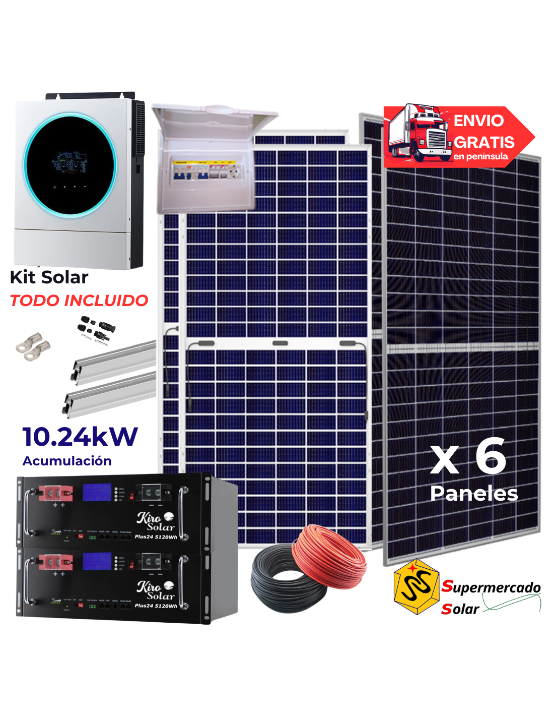Kit solar con baterías de litio para iluminación LED, Televisión LED, Nevera A++, Lavadora con agua fría, Bomba de 1CV (en horas de sol). Este kit se puede modificar ajustándolo a sus necesidades.